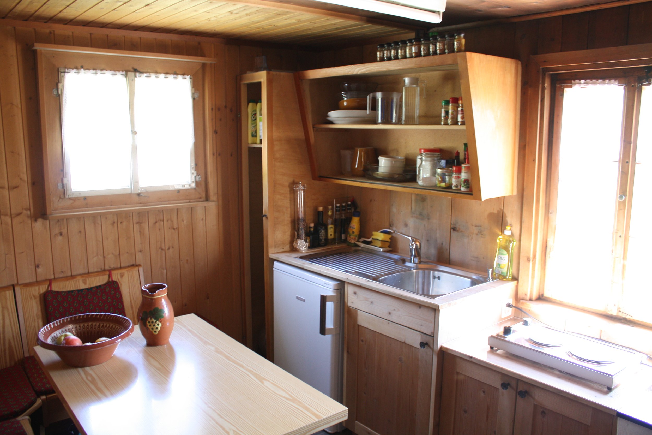 Küchentücher, Geschirr und Gewürze stehen bereit. Neben dem Holzfeuerherd stehen auch zwei elektrische Herdplatten zur Verfügung. Abfallmarken können im Dorfladen in Sur bezogen werden.